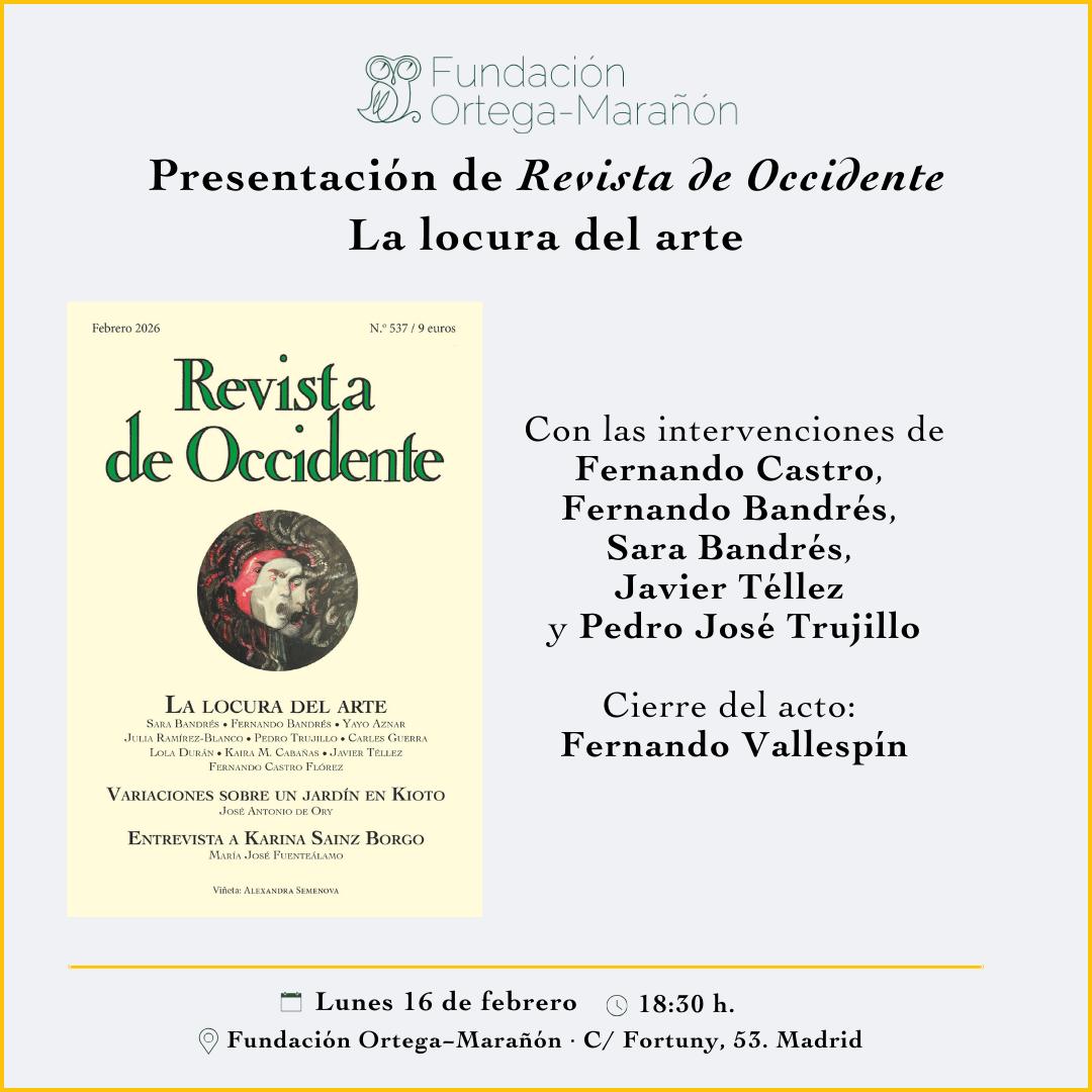 Revista de Occidente presenta su número de febrero “La locura del arte”, que explora los vínculos —a veces inquietantes— entre creación artística y enfermedad mental. Coordinado por Fernando Castro Flórez, el monográfico recorre autores y corrientes que han pensado esa frontera (de Artaud a Dalí, de Lombroso a Foucault, del surrealismo al art brut) y reúne las firmas de Yayo Aznar, Julia Ramírez, Pedro Trujillo, Carles Guerra, Lola Durán, Kaira M. Cabañas, Javier Téllez, Margarita Sánchez-Mármol, Sara Bandrés y Fernando Bandrés.