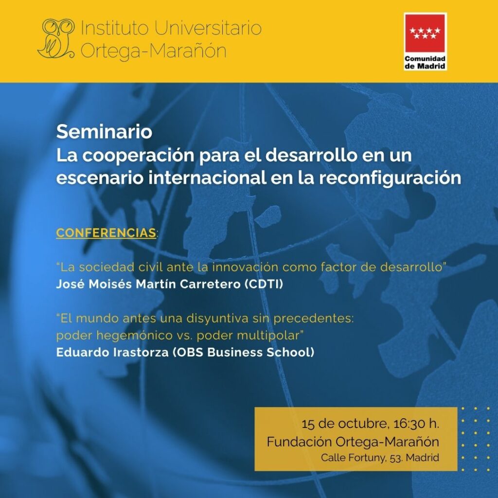 El Máster Universitario en Cooperación Internacional y Gestión de Políticas Públicas del Instituto Universitario de Investigación Ortega-Marañón inaugura una nueva edición de su Seminario sobre los grandes retos de la cooperación internacional, continuando así con una tradición consolidada en el programa académico. La sesión de apertura contará con la participación de destacados expertos que abordarán cuestiones clave para el presente y el futuro de la cooperación internacional: José Moisés Martín Carretero, director general del Centro para el Desarrollo Tecnológico y la Innovación (CDTI), dependiente del Ministerio de Ciencia, Innovación y Universidades, impartirá la conferencia titulada «La sociedad civil ante la innovación como factor de desarrollo». Eduardo Irastorza, profesor de OBS Business School, ofrecerá la ponencia «El mundo ante una disyuntiva sin precedentes: poder hegemónico vs. poder multipolar». Este seminario se plantea como un espacio de reflexión crítica y diálogo interdisciplinar para analizar los desafíos actuales en la agenda internacional del desarrollo, así como los nuevos marcos de gobernanza y cooperación. Colabora: Comunidad de Madrid ¿Cuándo? 15 de octubre, 16:30 horas ¿Dónde? Fundación Ortega-Marañón. C/ Fortuny, 53. Madrid |