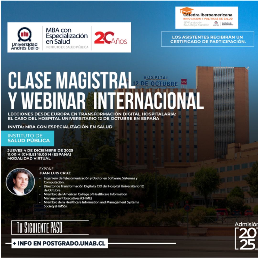 La Cátedra Iberoamericana de Innovación y Políticas de Salud, impulsada por el Instituto de Salud Pública de la Universidad Andrés Bello (Chile) y el Centro de Estudios Gregorio Marañón de la Fundación Ortega-Marañón, organiza el Webinar Internacional «Lecciones desde Europa en transformación digital hospitalaria: el caso del Hospital Universitario 12 de Octubre en España».